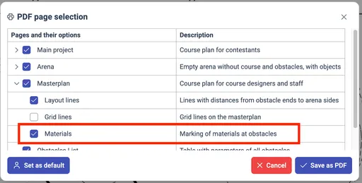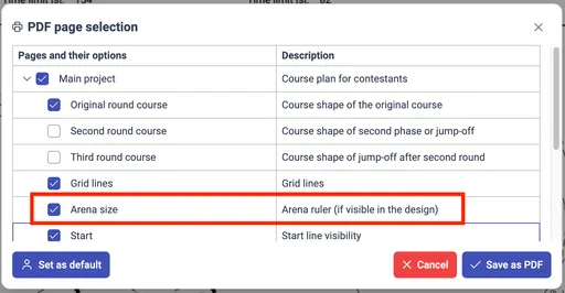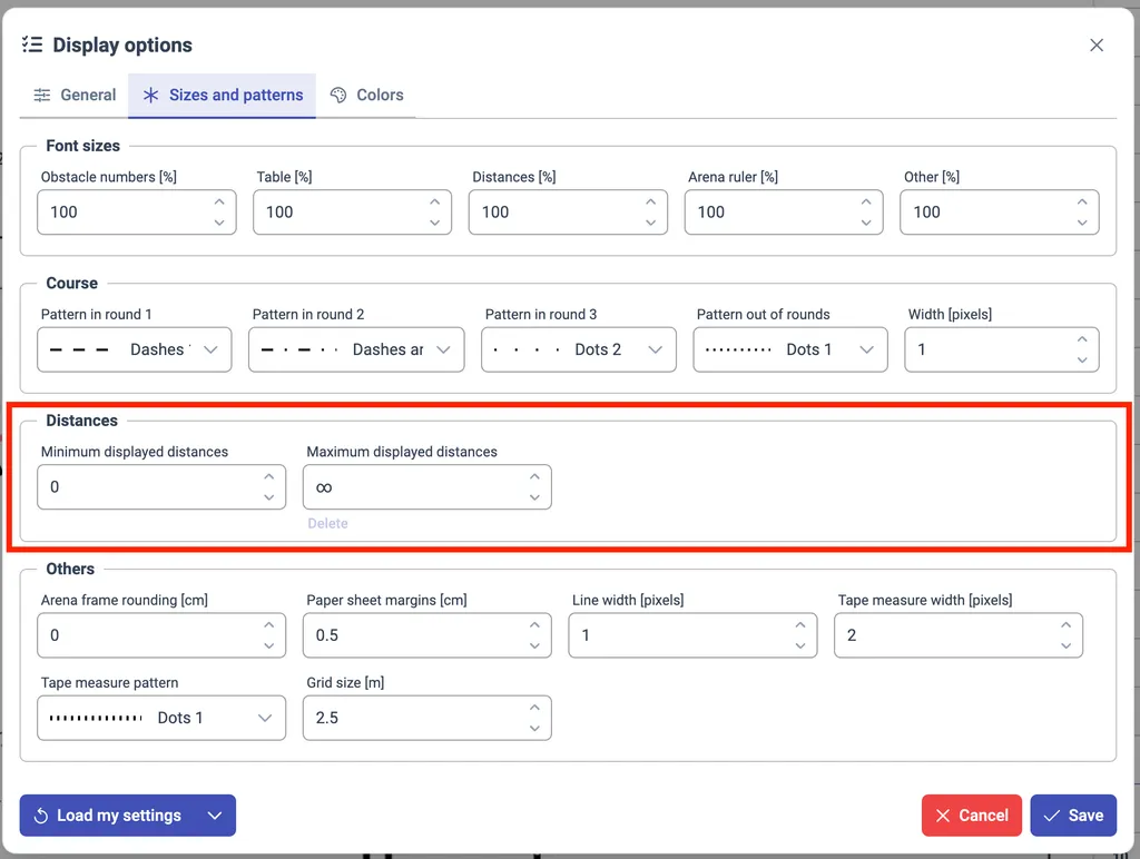 Added a field to the Display Options → Sizes and patterns to configure a range of distances for which they will be visible in the editor and on the Masterplan printouts. This allows to declutter the designs and focus better when designing and setting up the course on the arena. The default range is unlimited, meaning all distances are visible.