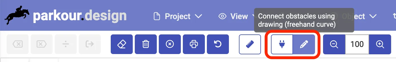 This method is similar to the previous one, but instead of extending a line, you can draw the exact shape of the course you want. In this method, the connecting mode should be set to Connecting obstacles using drawing (freehand curve) – it can be selected with the button on the Buttons panel or toggled with an option in the Edit menu or with the default keyboard shortcut E.
