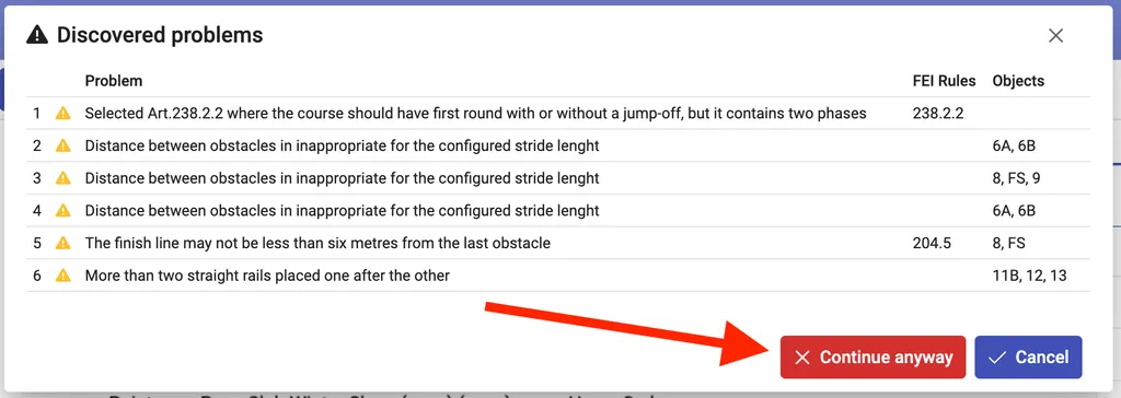 - Federation rules compliance – any specifics that are defined in the Jumping Rules published by the federation of the selected competition type. They will be validated only if the article is configured for the design. The list of rules is quite large and we are not publishing it here in a form of a table.
