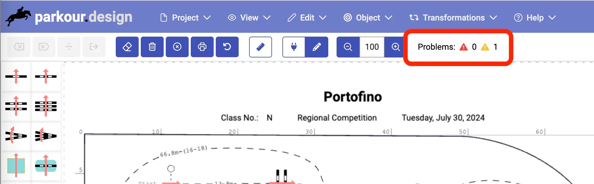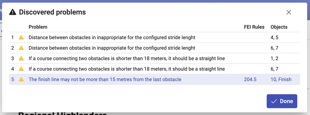- Competition class compliance – heights, spreads, numbers of obstacles, efforts, time, distance, etc. as required by the configured competition class. It will be validated only if the competition class is configured for the design.