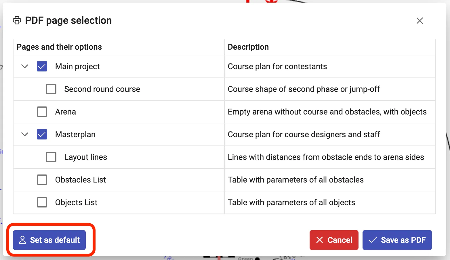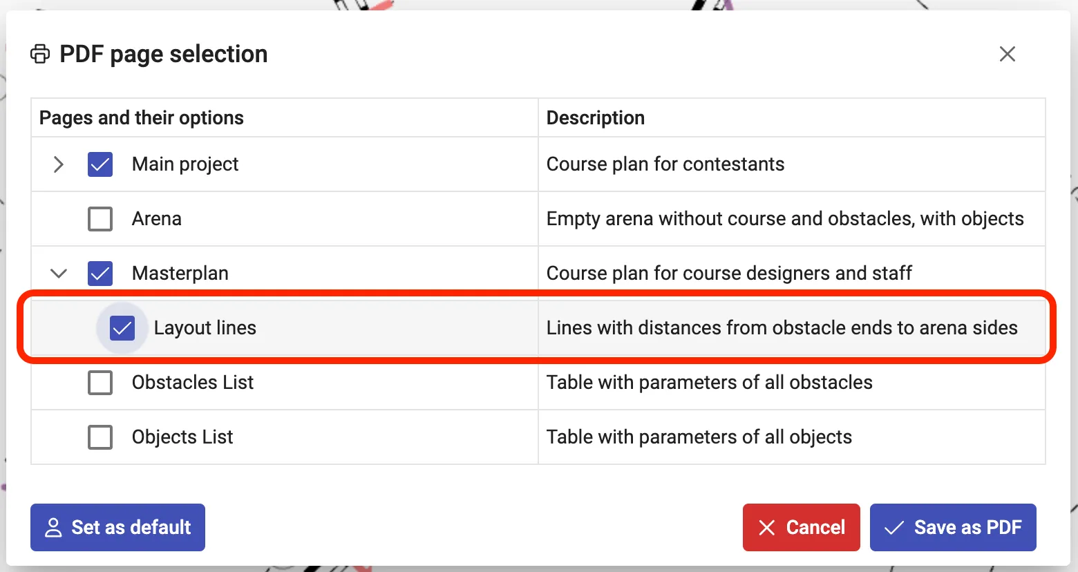 Aby wydrukować lub zapisać na Masterplanie w PDF linie odległości, należy zaznaczyć opcję Linie końców przeszkód w oknie wyboru stron.