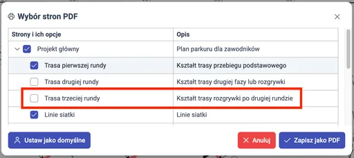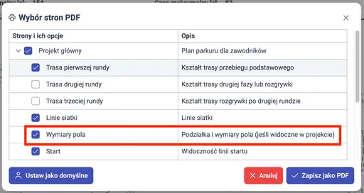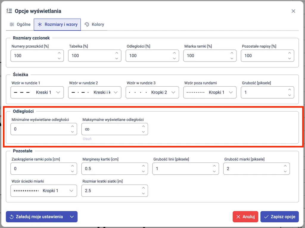 Dodano pole w Opcje wyświetlania → Rozmiary i wzory do konfigurowania zakresu odległości, dla których będą one widoczne w edytorze oraz na wydrukach Masterplanu. Pozwala to na uporządkowanie projektów i lepsze skupienie się podczas projektowania i ustawiania toru na placu. Domyślny zakres jest nieograniczony, co oznacza, że wszystkie odległości są widoczne.